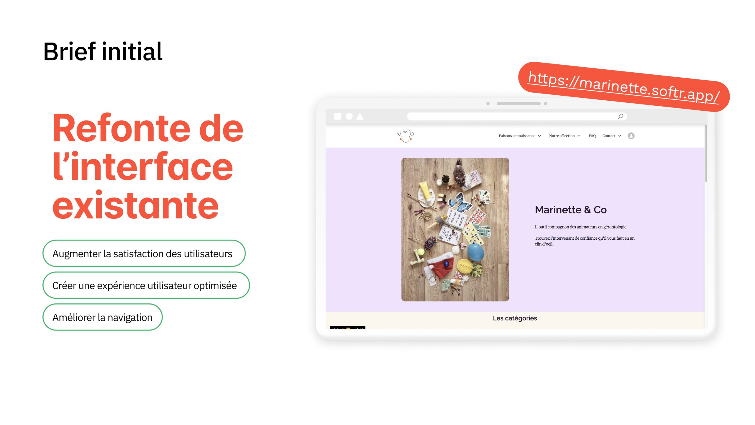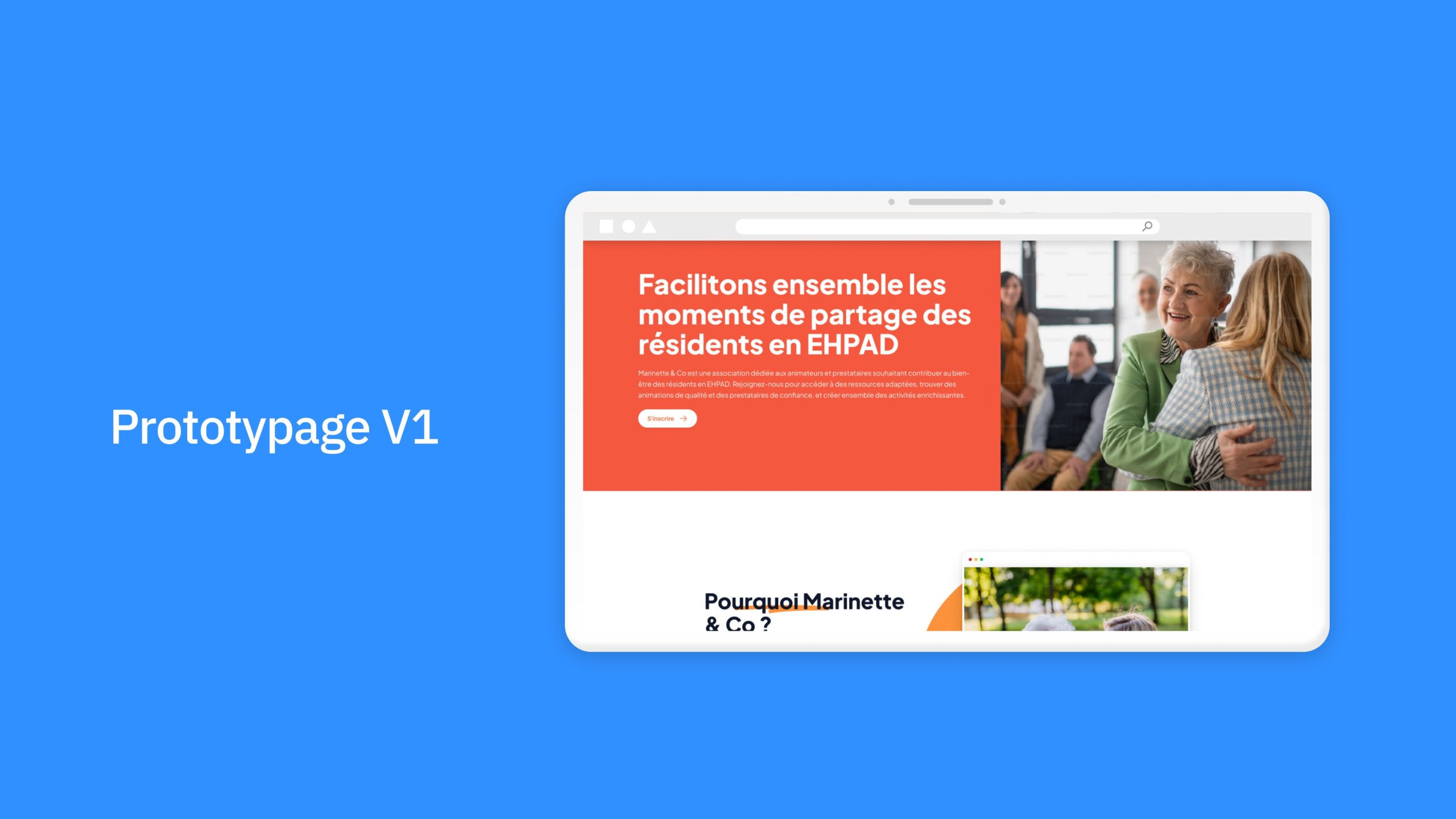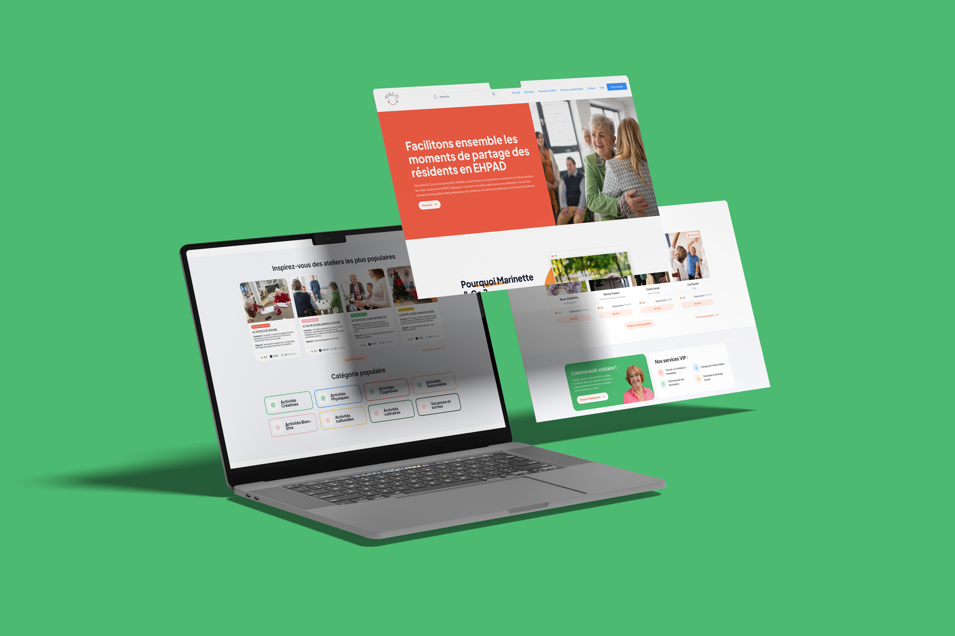 Le projet « Marinette & Co » vise à transformer une plateforme dédiée aux EHPAD, facilitant la connexion entre animateurs et prestataires externes. Grâce à une recherche utilisateur approfondie, nous avons identifié les besoins clés et développé une interface intuitive. Le nouveau site offre des fonctionnalités comme le partage de fiches résidents, la recherche de prestataires de qualité, et la demande de devis. L’objectif est d’améliorer la qualité de vie des résidents tout en simplifiant le travail des animateurs. Ce projet reflète une approche centrée sur l’utilisateur pour répondre efficacement aux défis des EHPAD.