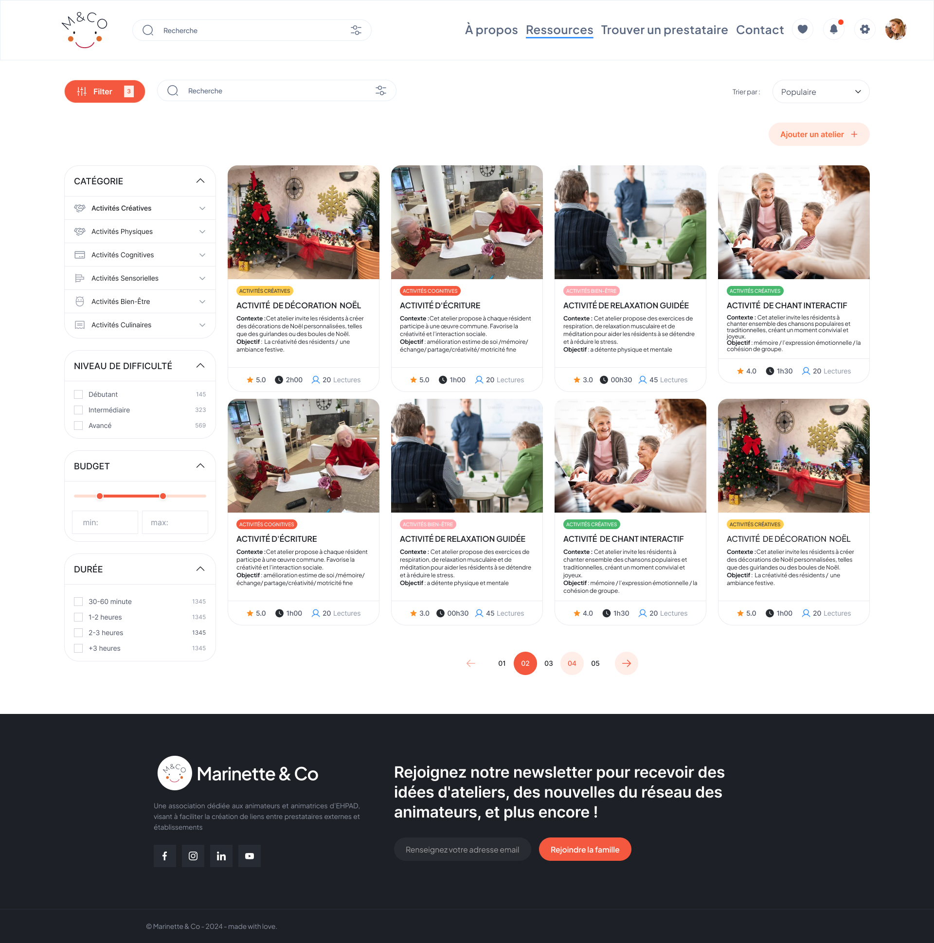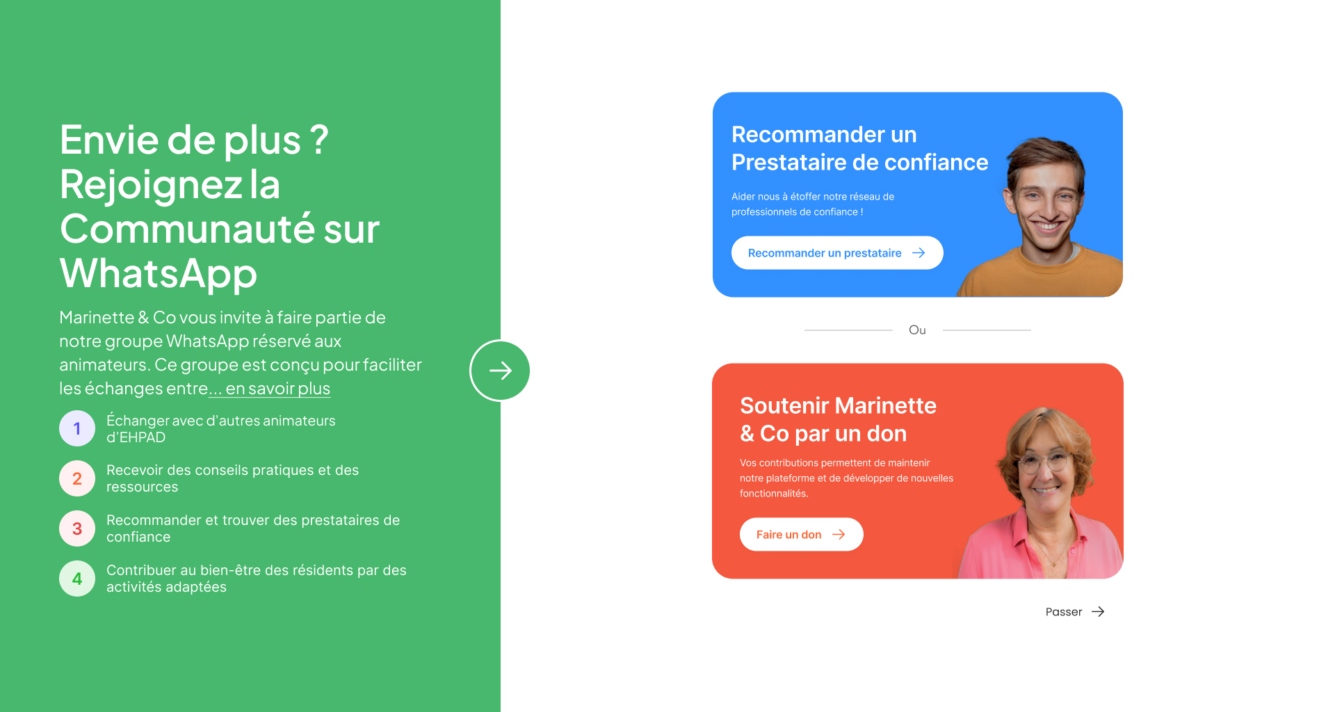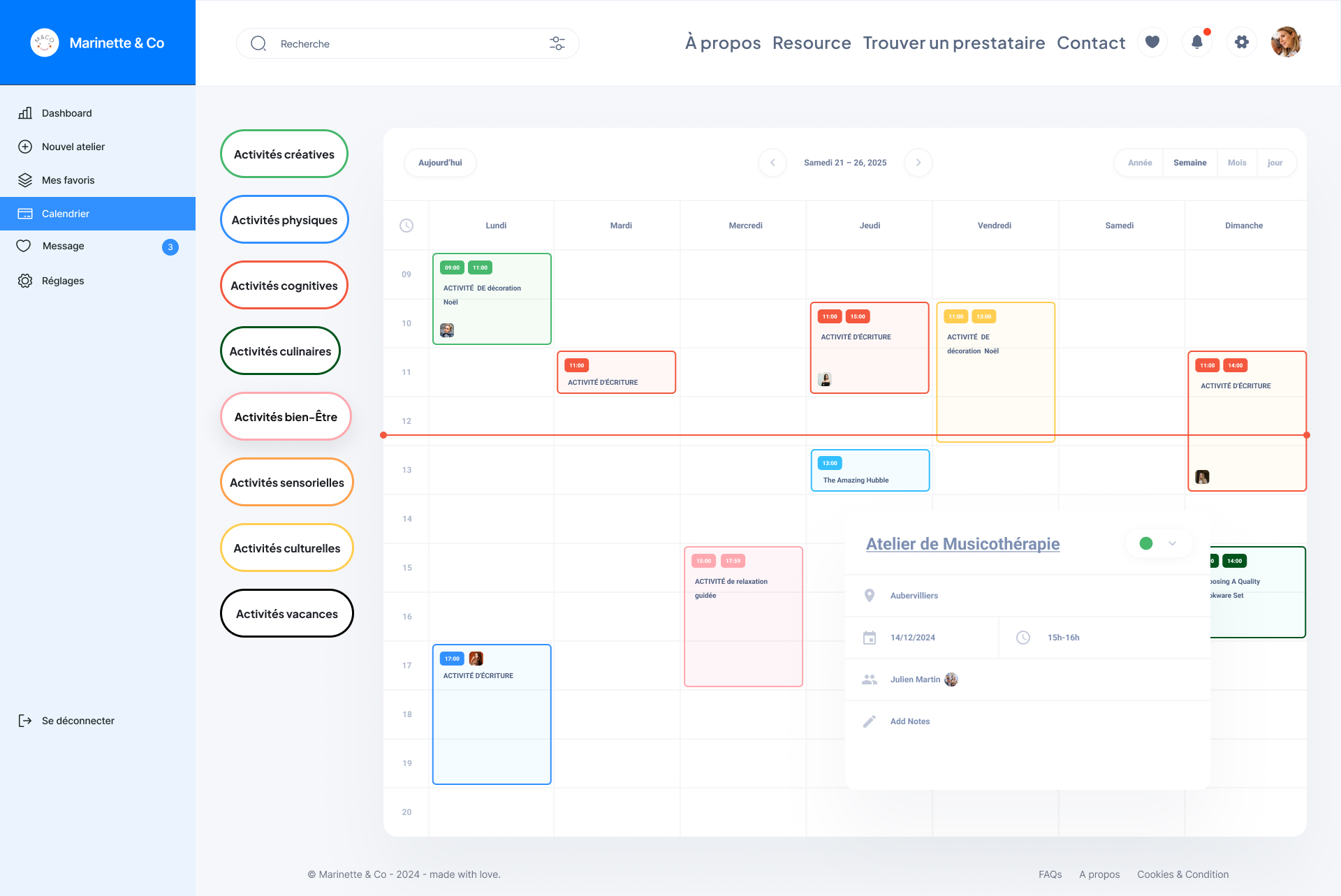 Le projet « Marinette & Co » vise à transformer une plateforme dédiée aux EHPAD, facilitant la connexion entre animateurs et prestataires externes. Grâce à une recherche utilisateur approfondie, nous avons identifié les besoins clés et développé une interface intuitive. Le nouveau site offre des fonctionnalités comme le partage de fiches résidents, la recherche de prestataires de qualité, et la demande de devis. L’objectif est d’améliorer la qualité de vie des résidents tout en simplifiant le travail des animateurs. Ce projet reflète une approche centrée sur l’utilisateur pour répondre efficacement aux défis des EHPAD.