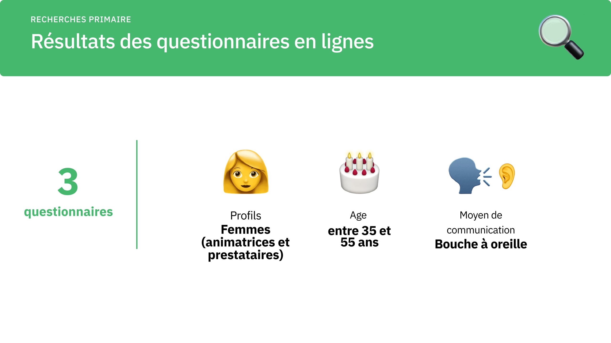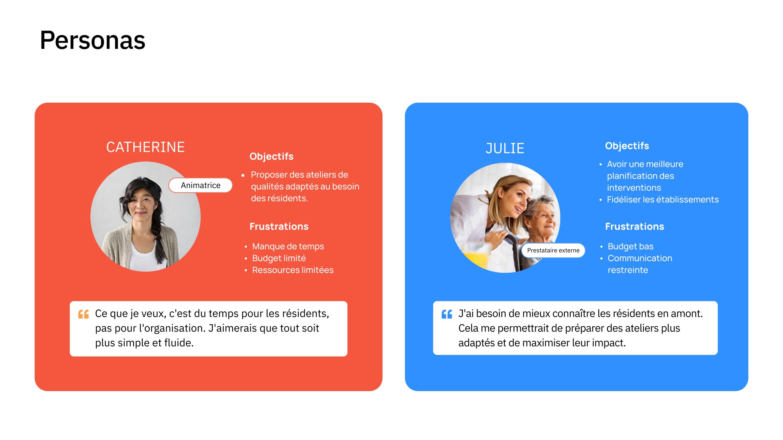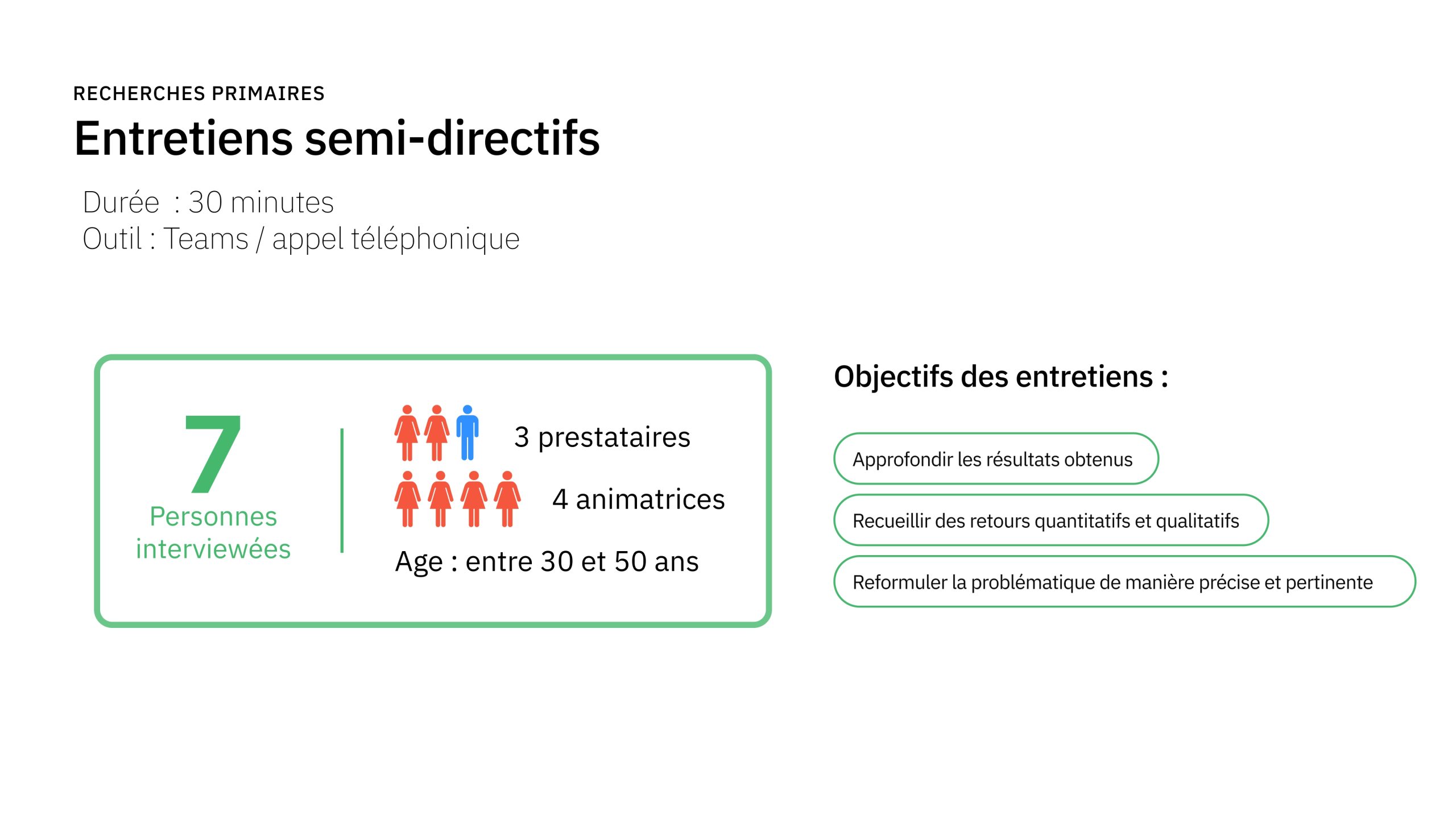 • Recherche Utilisateur : Nous avons mené des recherches primaires et secondaires pour comprendre les besoins des animateurs et des prestataires externes, incluant des questionnaires et des entretiens semi-directifs.